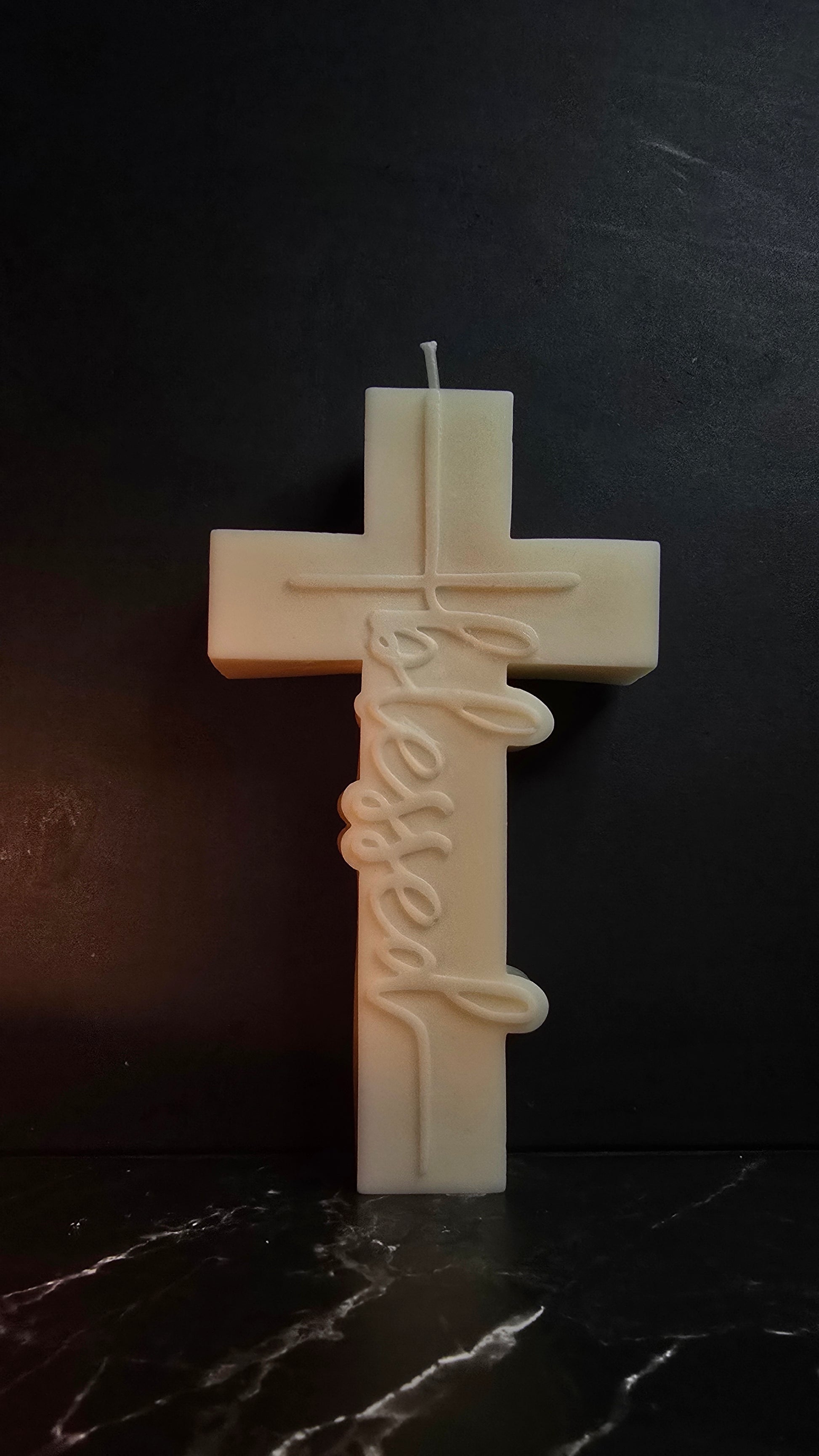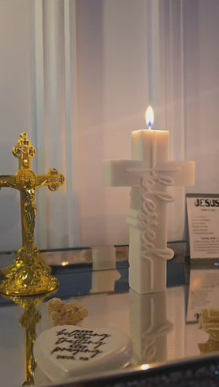 Illuminate your faith with our Blessed Cross Candle, a beautiful symbol of divine grace and sacrifice. Featuring an elegant cross design with the word "Blessed" inscribed, this candle serves as a reminder of God's continuous blessings and love through the cross. The soft, flickering light brings a serene ambiance to any space, making it perfect for prayer, meditation on Christ, or simply adding a touch of devotion to your home or altar.