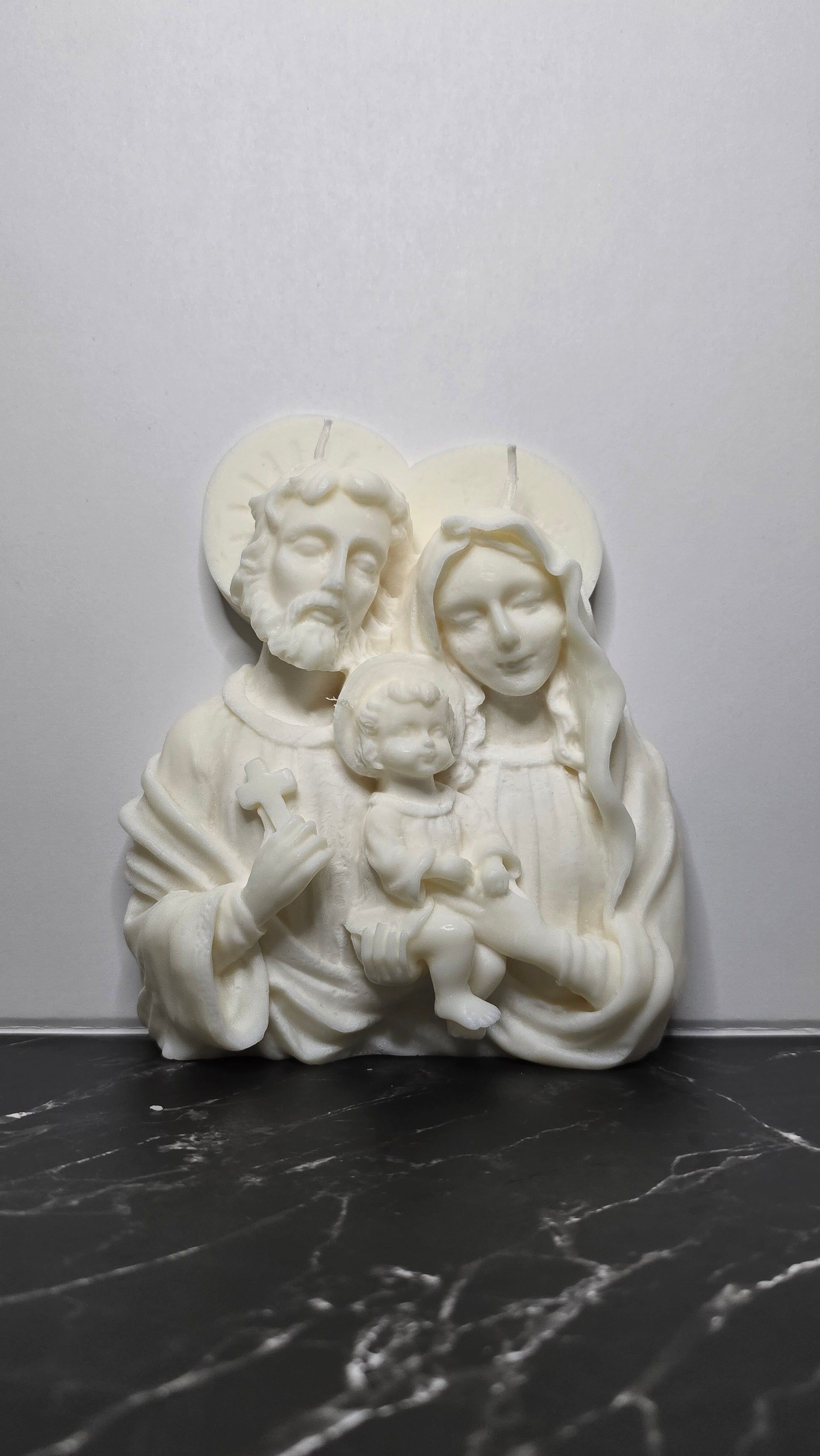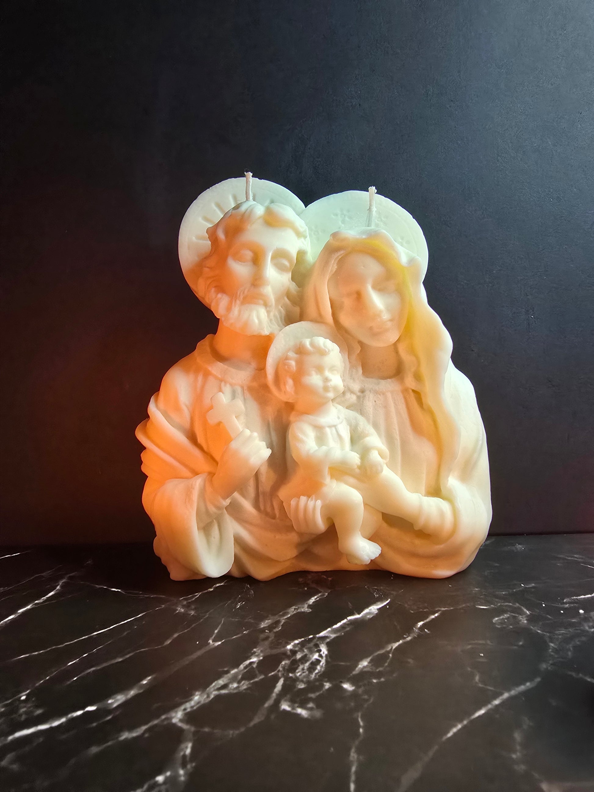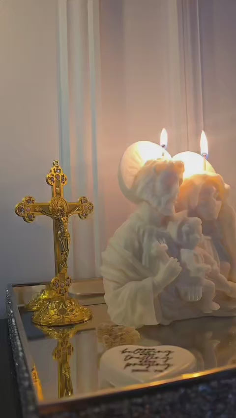 Celebrate the true spirit of Christmas with our Holy Family Candle, a beautiful depiction of the love and devotion shared by Joseph, Mary, and Baby Jesus. This candle features a serene and loving image of the Holy Family gathered together in reverence, honouring the miraculous birth of our Saviour. Its gentle glow serves as a reminder of the joy, peace, and hope that the birth of Christ brings to the world.